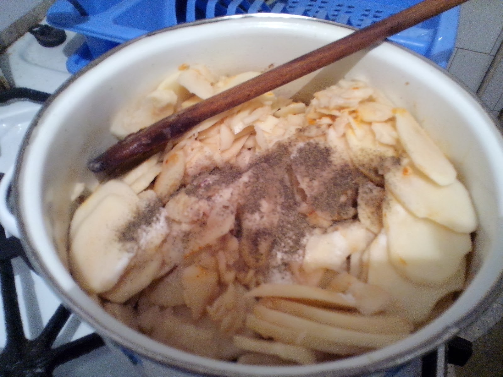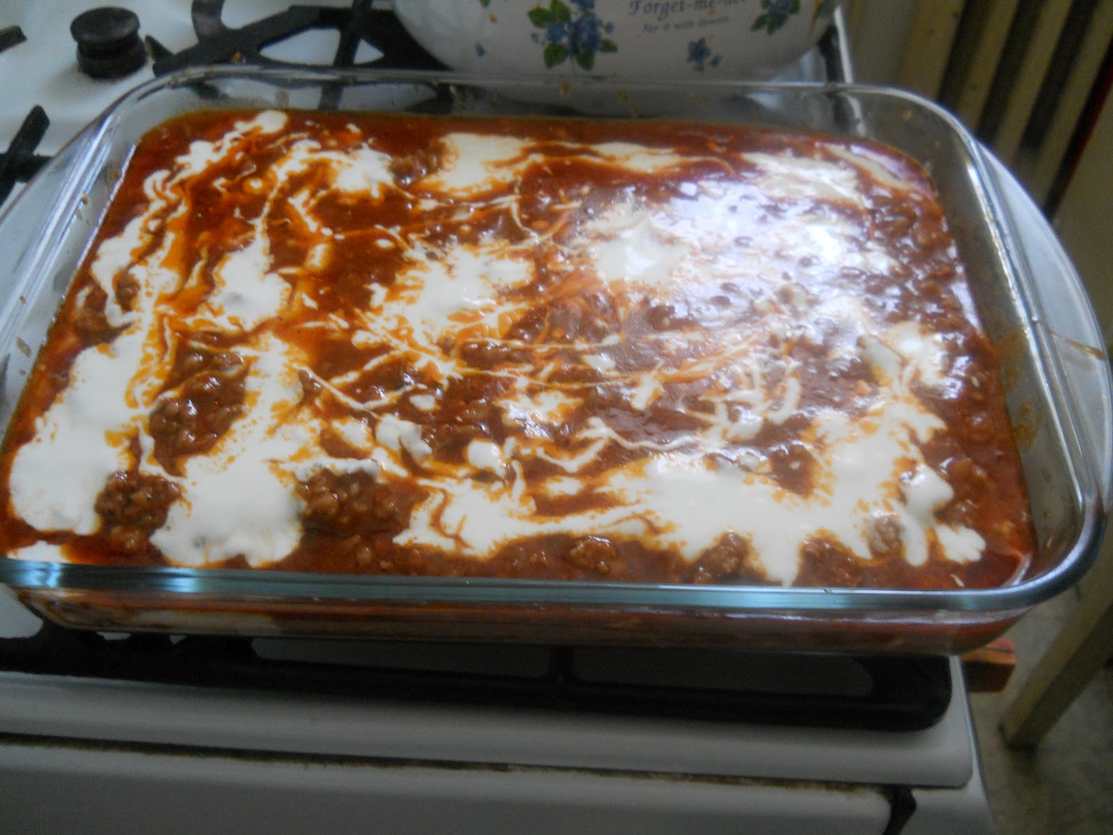 Fogom a szószt kanalazok néhányat az edény aljára, (akinek nincs ilyen edénye nyugodtan teheti kerekbe is ott még annyit kell csinálni pluszba, hogy összekell törni a lapokat, hogy elférjenek egymás mellett, ne tegyük egymásra csak egymás mellé), egy pár kanál tejföl keveréket csepegtetek bele majd rá rakom a lapokat, és így megyünk sorba felfele, szósz - tejföl - lap, amíg az egész el nem fogy. A lényeg az hogy a lap ne látszódjon ki a szószból, mivel nincs megfőzve, így majd ebbe a szószban fog megfőni és megpuhulni. Még egy dolog, azért teszek a tejfölbe lisztet, mert az be fogja sülés közben sűrűsíteni a szószt, ettől nem lesz olyan folyékony.