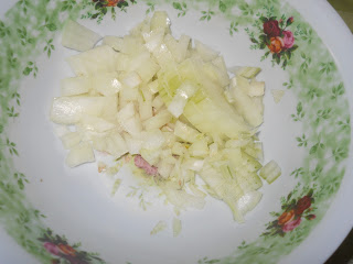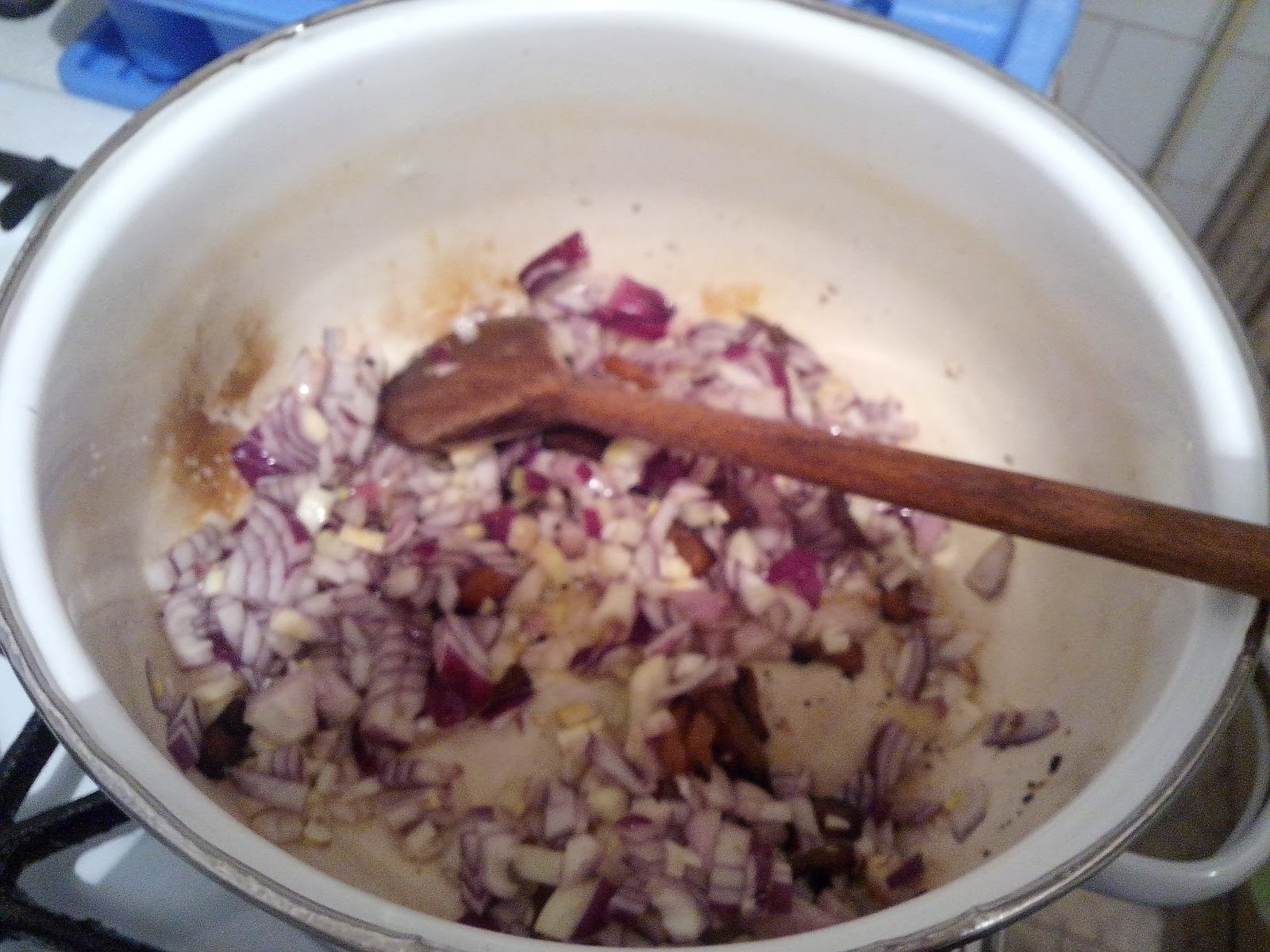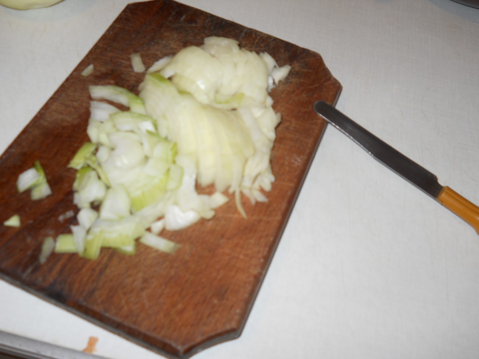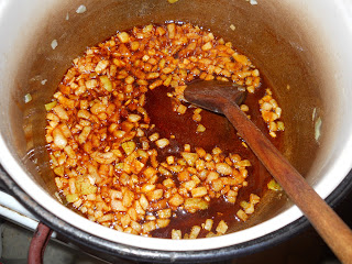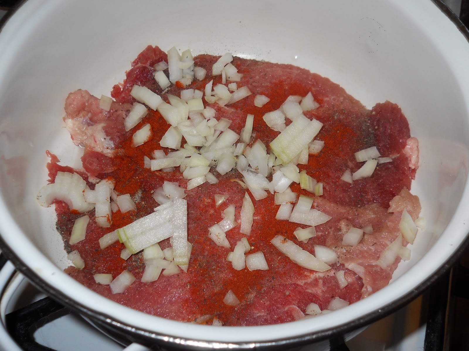 A hagymát apróra vágva szépen megdinsztelem, szép aranybarnára pirítom őket, a megszokottól eltérően, most nem a pirospaprika következik hanem a darált hús.