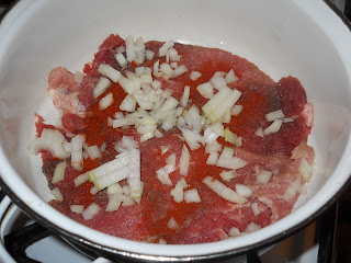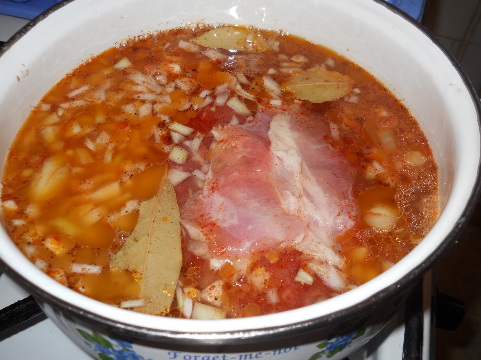 Keverés után kb. dupla annyi vizet szoktam, hozzáadni mint amennyi ellepi. Lefedem és hagyom főni, egy kb 45-60 percet, hogy a hús főjön át és a lé is fogyjon el kb. a felére.