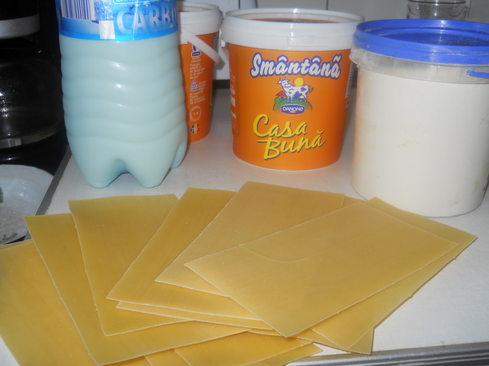 Az összeállításhoz: 2 tejföl (nem a kicsi, hanem a nagyobb csupros, összesen legyen kb. 450 gr.) 1 evőkanál liszt, és tej a hígításhoz, és Lasagne tészta, lapok.