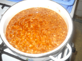 Az apróra vágott fokhagyma után jöhet a kb. 2 - 2,5 evőkanál paradicsom paszta, ettől az egész kicsikét besűrűsödik és finom íze is lesz.